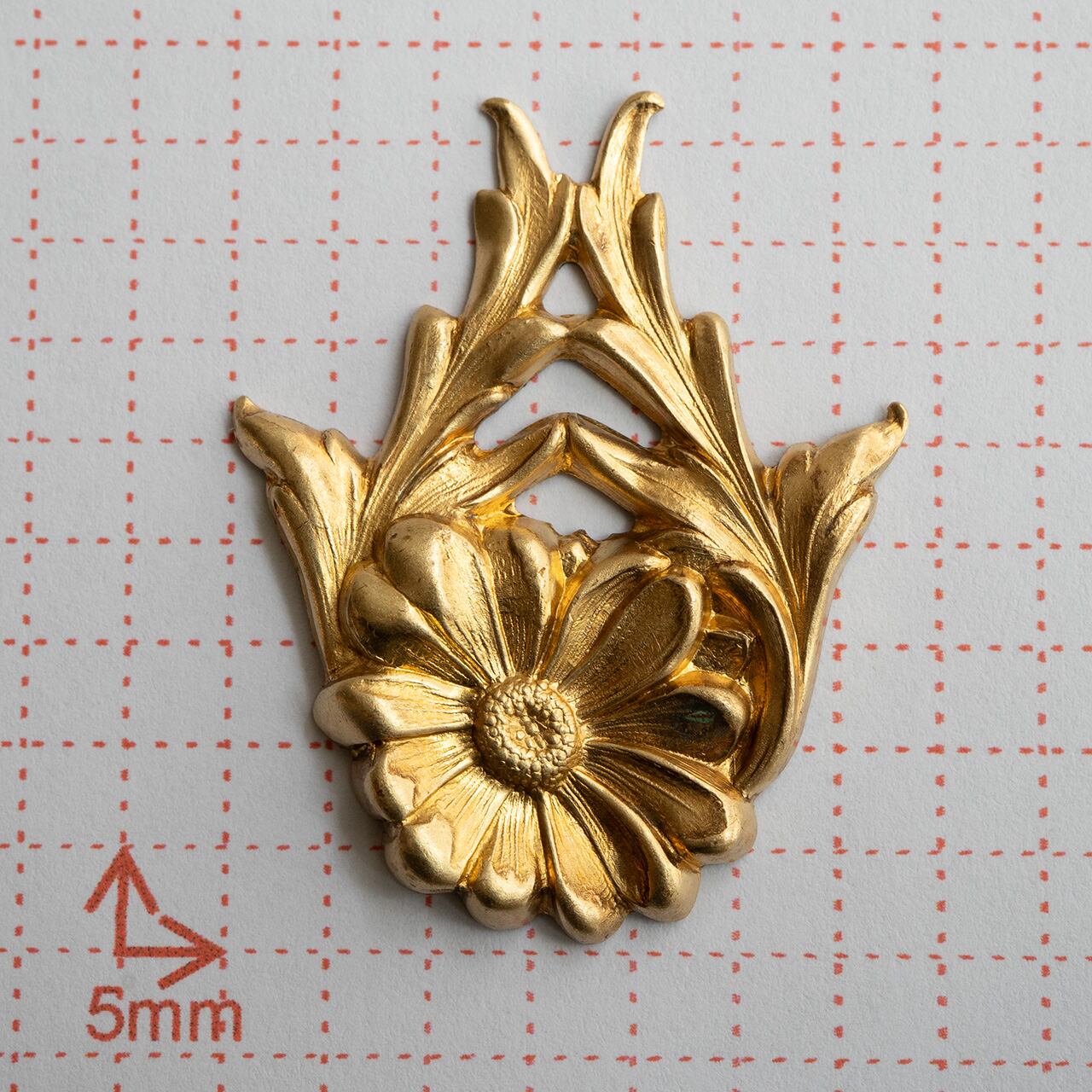 ひなぎく(デイジー)がモチーフの真鍮のパーツ。葉っぱの部分にCカンが通るようにうまくデザインされています。長すぎず、インパクトのあるイアリングやピアスができそうです。左右の1ペアでお届けします。
