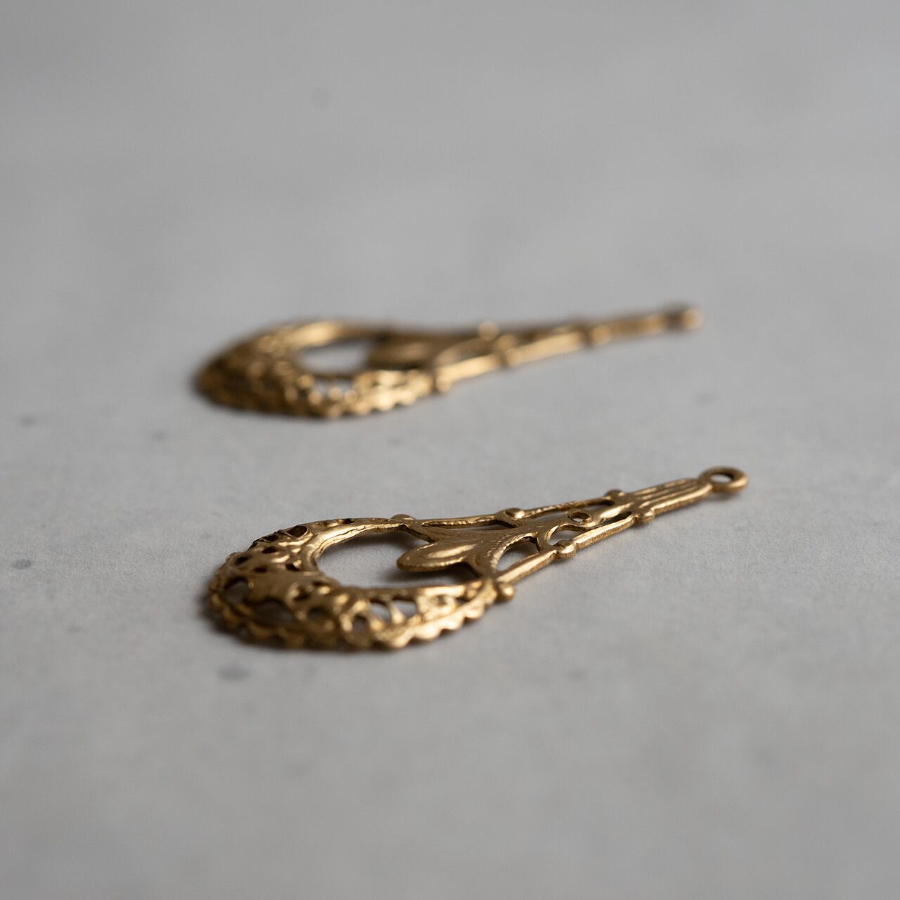 丸みがありながらもスッキリと洗練された形のプレスチャームです。透かしの模様が繊細です。イヤリングやピアスにちょうど良さそうです。