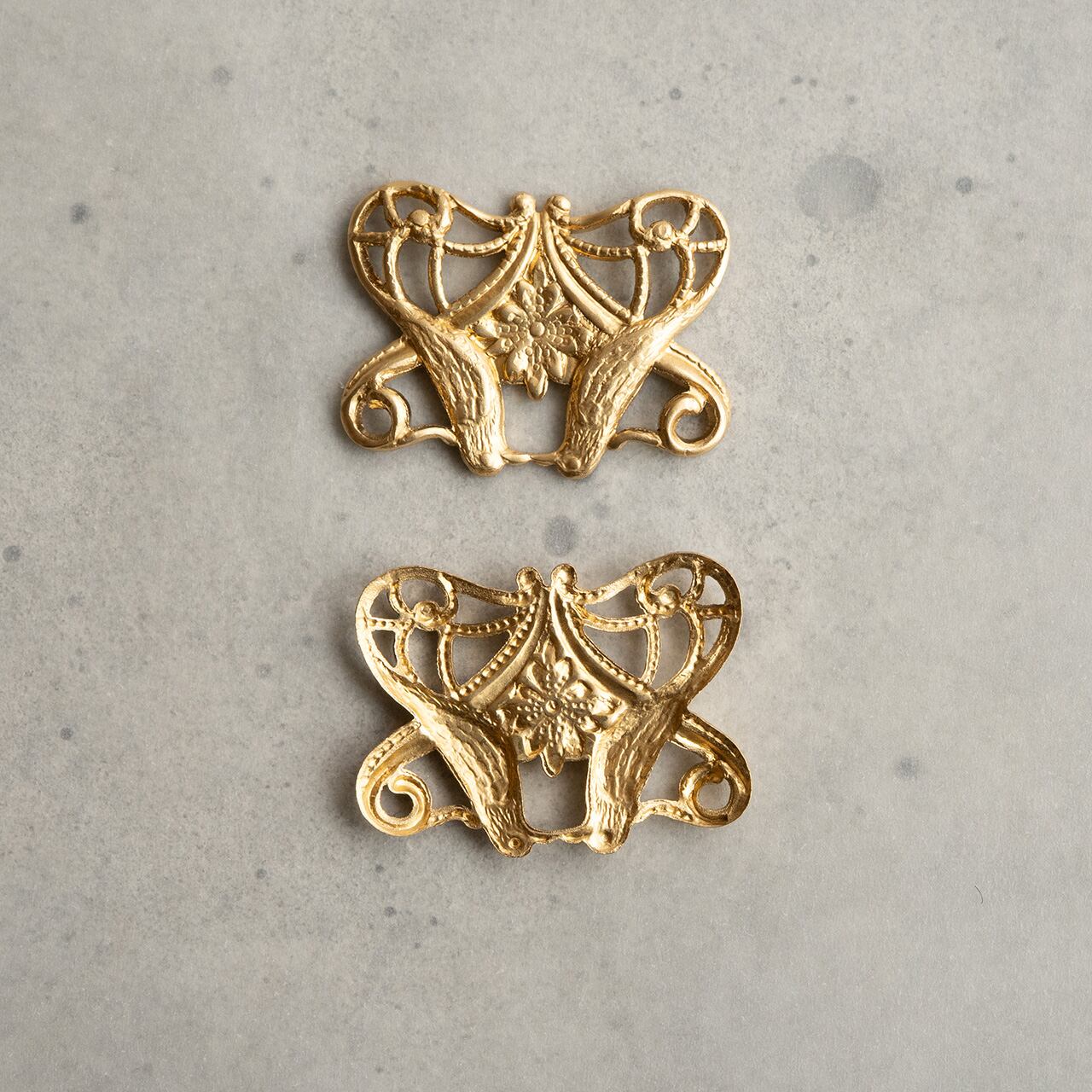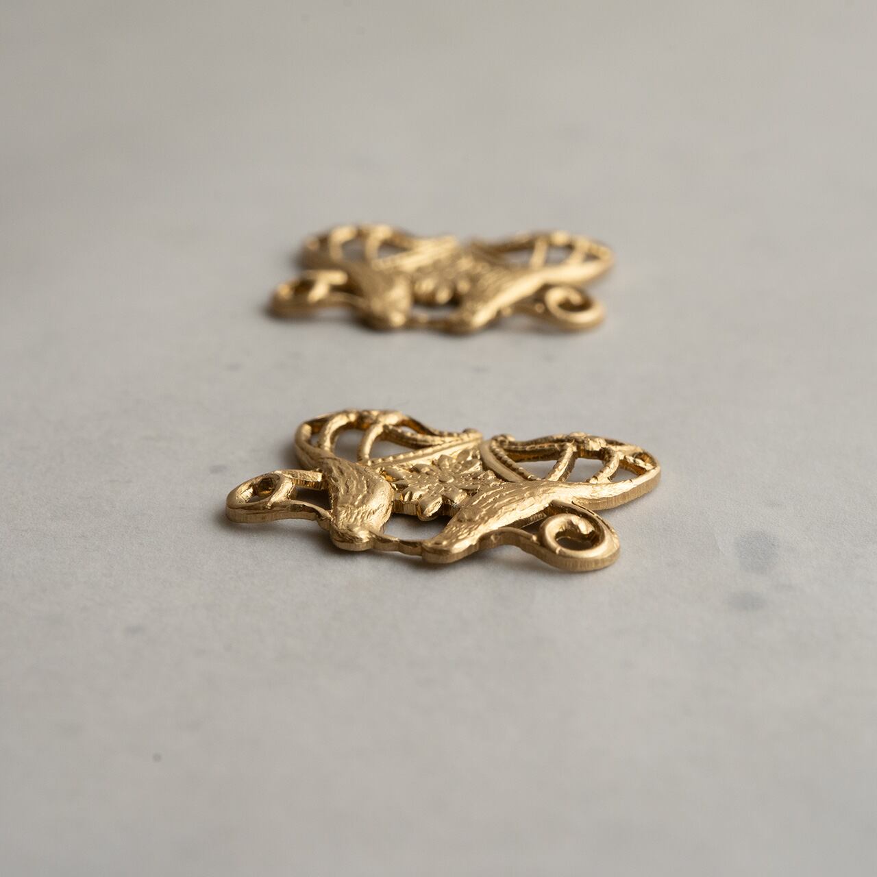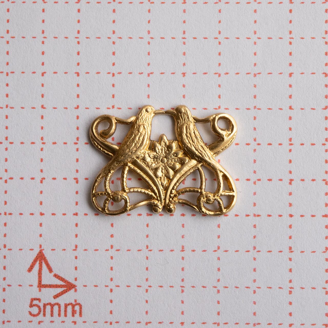 向かい合わせの鳥がデザインされたコネクターです。大袈裟にならずすっきりと馴染んでいるデザインが素敵だな。ブレスレットの駒のように使うのも楽しそうです。