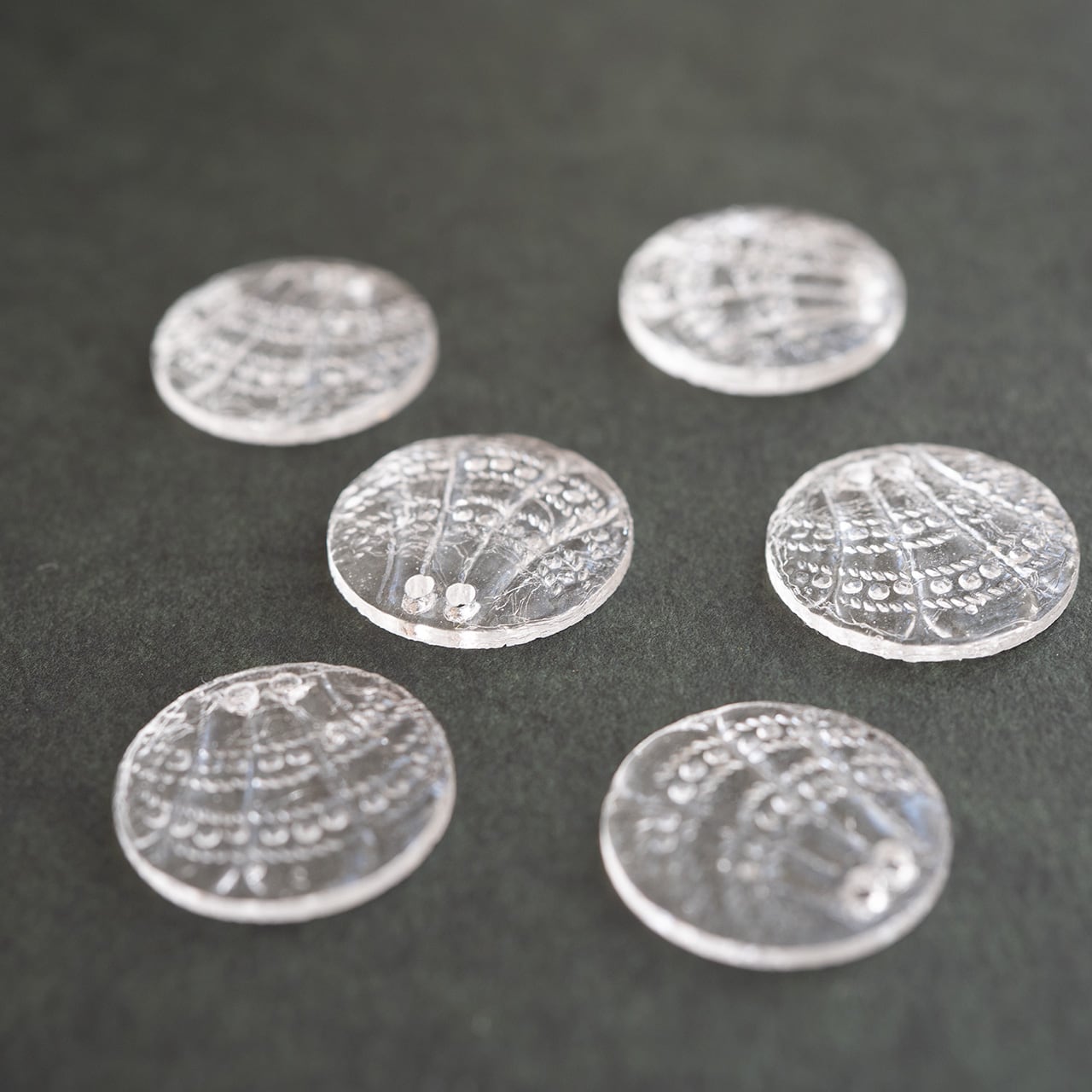 貝の模様のような薄いクリアなガラスのチャーム、レースのように繊細に模様が浮き出しています。2つ穴を活かしてペンダントなどに使ってみてください。