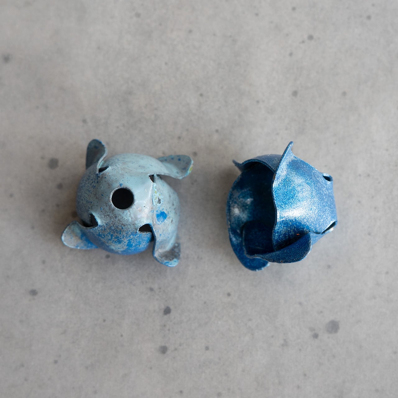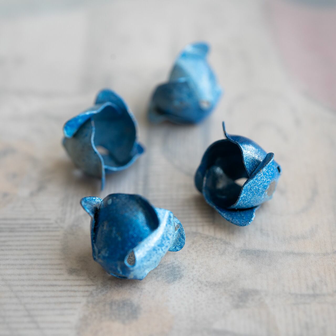 青いペイントがされたすずらんみたいなチャームです。このままいくつか繋げてチャームのように使ってもいいし、ビーズキャップにしても良いと思います。シャビーシックな雰囲気でモノトーンのアクセサリーとも相性が良さそうです。