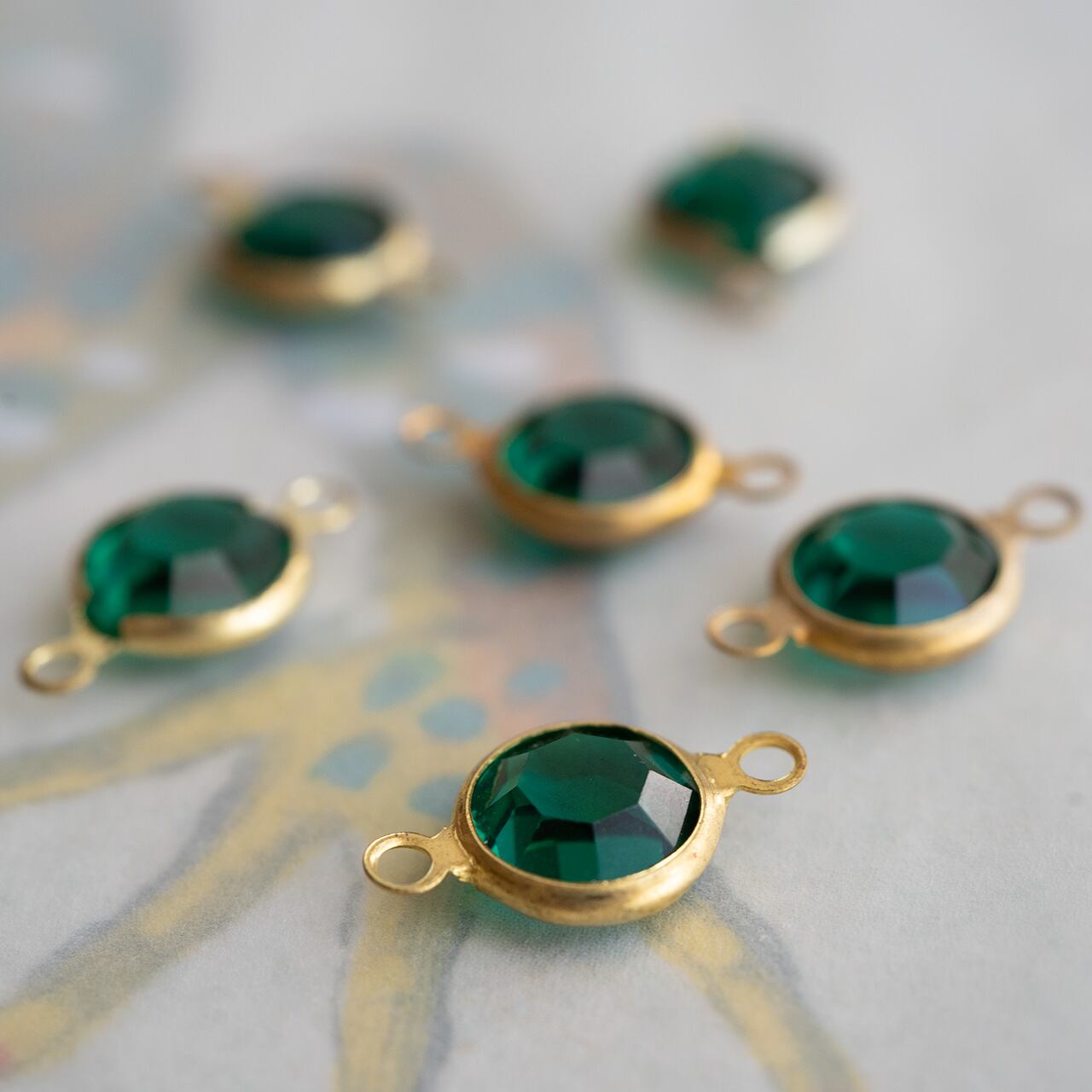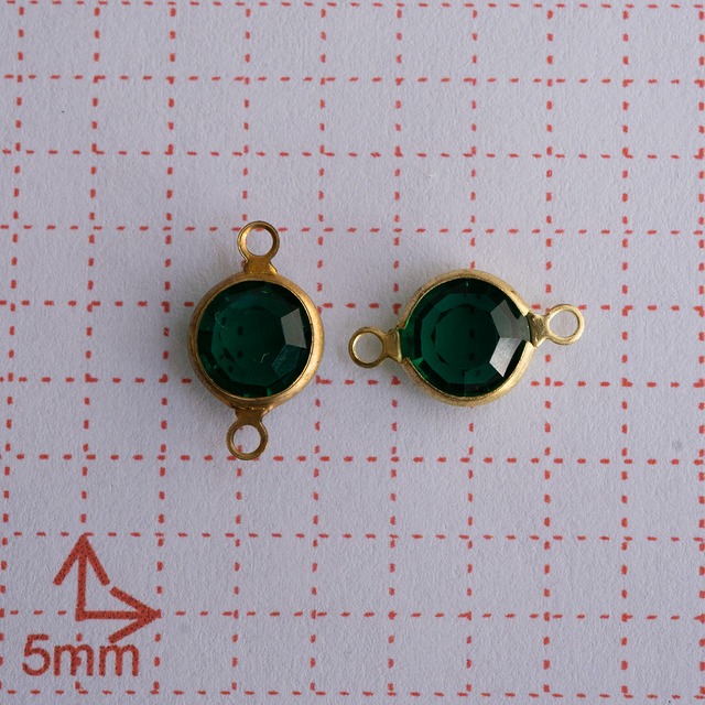 エメラルドグリーンと真鍮のゴールドが鮮やかな組み合わせのチャネルセッティングのコネクターです。両面からガラスが見える重宝なパーツです。