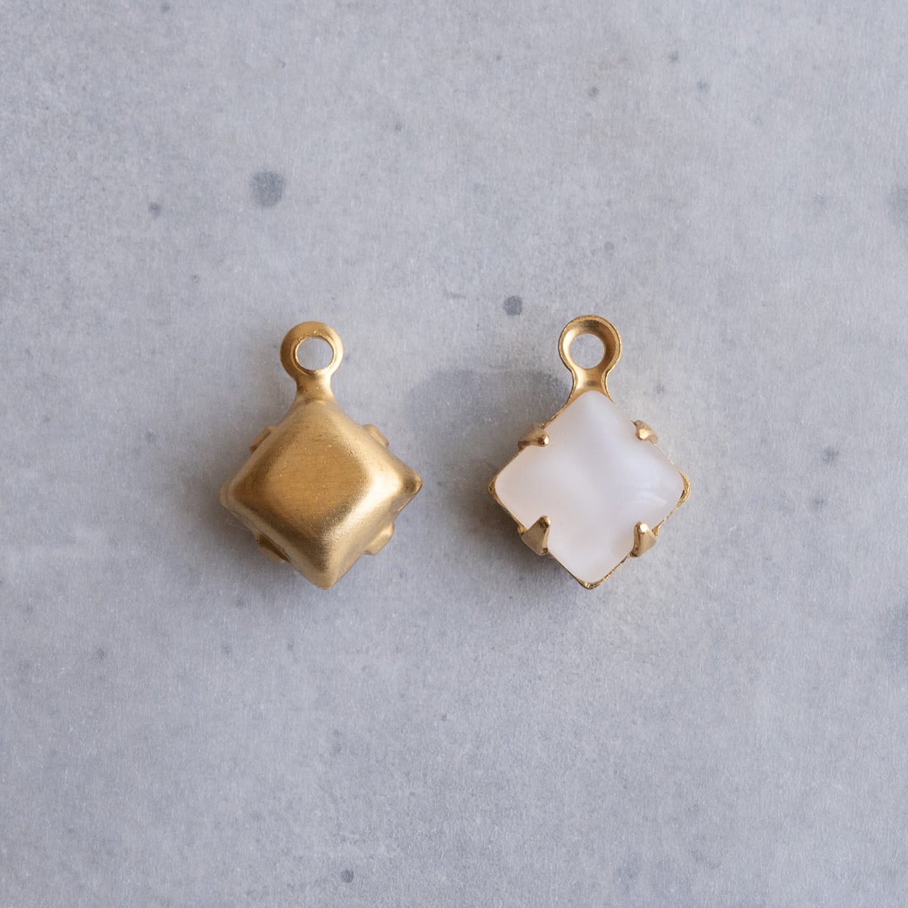マットな色味だけど艶感もある、小さな四角いストーンのチャームです。小粒なのであまりおじゃまをしません。さりげなく付けるかたくさん集めて繋いでいくか、アレンジが楽しくなるチャームです。