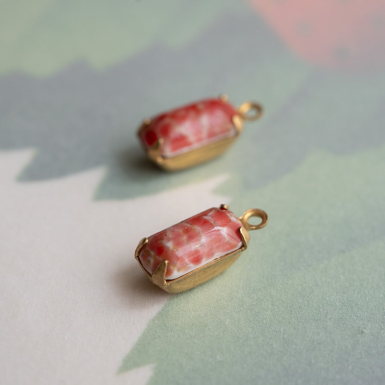 テラコッタのような色が白地に映えるツブツブと模様になったオクタゴンの小さめのチャーム、ドイツのヴィンテージです。ガラスに高さが少しありぷっくりとしています。着けやすいピアスにちょうど良い大きさです。
