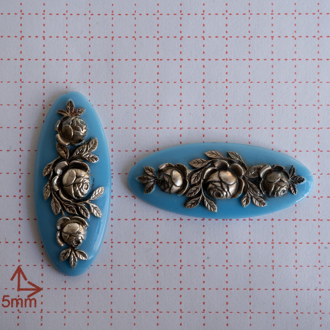 フランスで買付したローズがシルバーカラーの金属で表現されたカメオです。薔薇の花や葉っぱが細かく表現されとても美しいです。ヒヤシンスブルーのような美しい青にシルバーカラーのメタルがよく映えます。