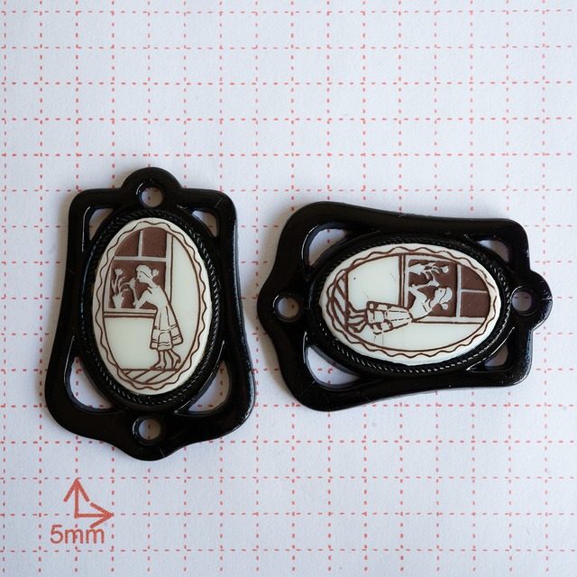 フランスで見つけました。恐らくフランス製だと思います。ガラスのユニークな黒の額縁のような枠に少女のシックで可愛らしい絵柄のカボションが載せられたペンダントトップです。こんな組み合わせなかなか出てこない発想、なかなか粋です。