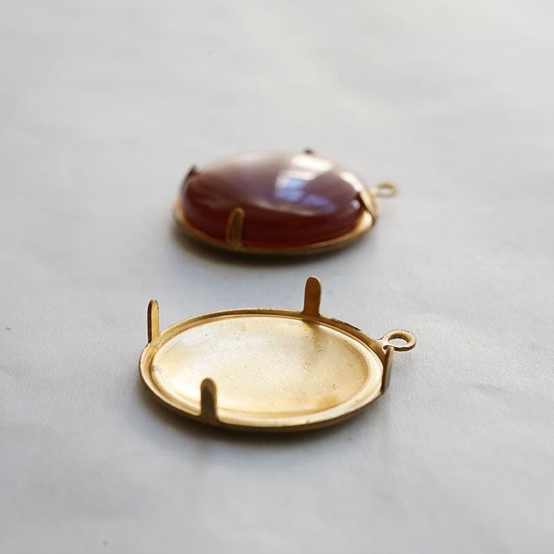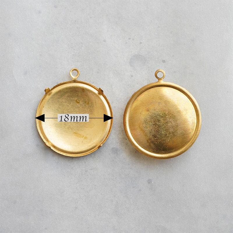 直径18ミリ、ラウンドカボーション用、made in USAの真鍮製の石座です。裏面がフラットなカボション用。爪が4つのシンプルな作りでほどよい厚みで留めやすいです。現行品です。