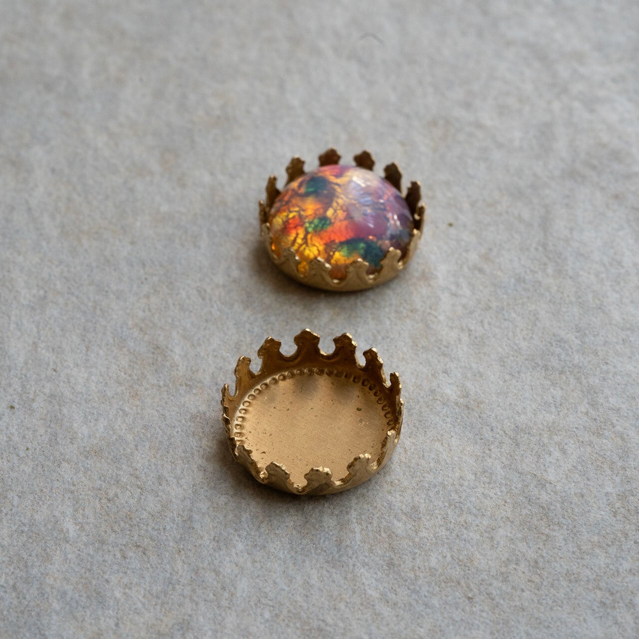 直径13ミリ、ラウンドカボーション用、made in USAの真鍮製の石座です。縁がレース状でクラウンセッティングができるようになっています。カボション、フラットバックのストーンに最適です。上質でしっかりとした作りで程よく厚みがあります。現行品です。