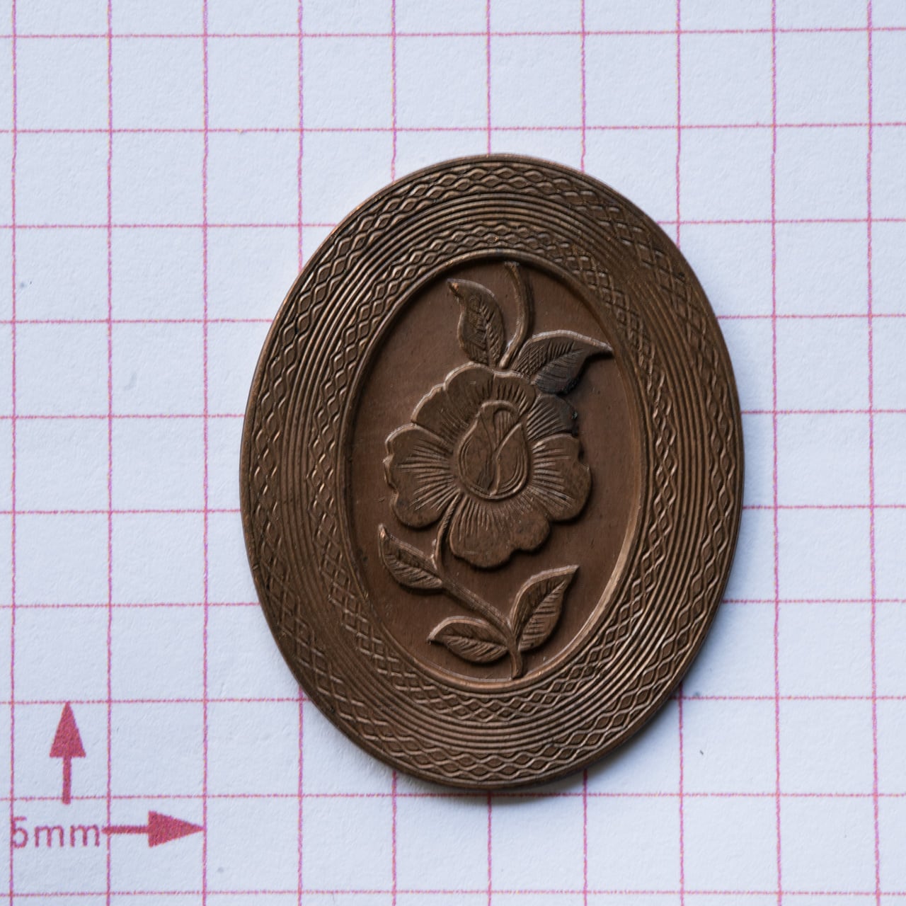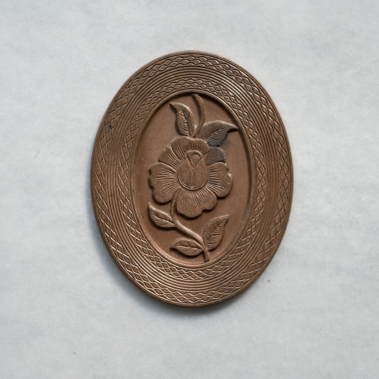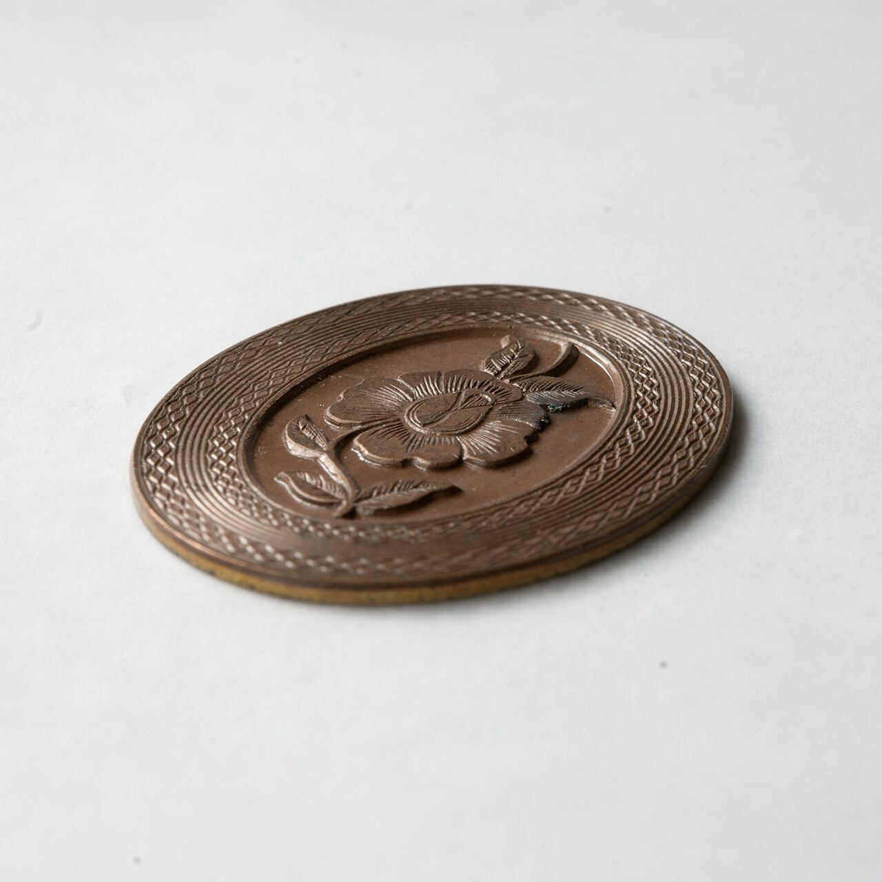 1950年代のデザートローズの模様が刻まれた真鍮のプレートです。しっかりとした厚みがあり、エナメルを施すために作られたものと思われます。縁にはこまかなギヨシェと呼ばれる細かい模様が刻まれています。なかなか貴重なプレート、このままペンダントなどに加工するのもよし、エナメルを施して豪華な作品に仕上げるもよしです。