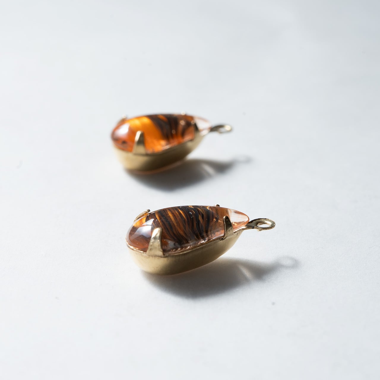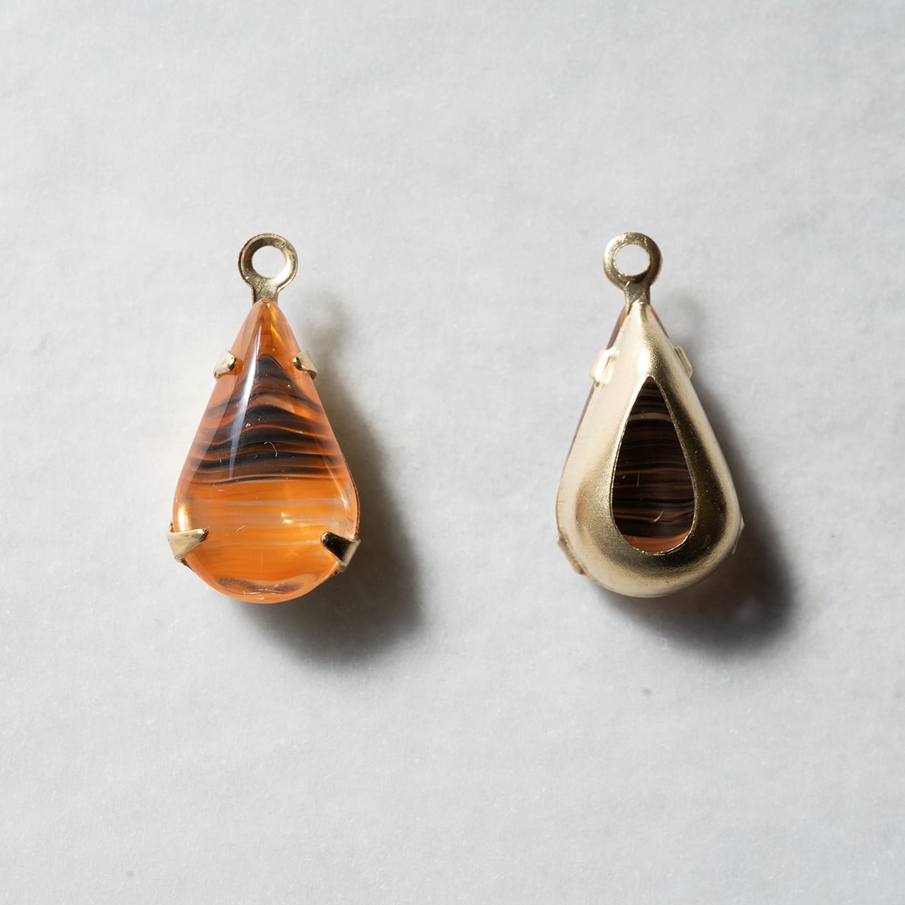 マーブルのよう縞模様のアンバー色、透明感があって大人っぽい。派手さはないもののとても個性的ないい色をしたガラスチャームです。一つずつの縞が違っていて一つずつの個性、ピアスやイアリングにすると左右が少し違っているのがいいです。
