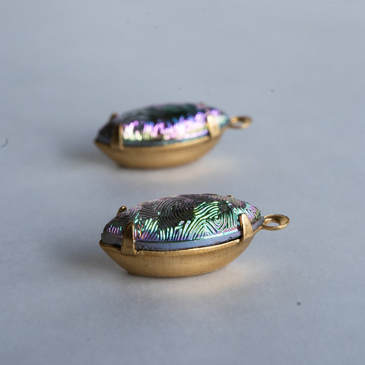 表面に細かく波のような模様が入った面白いテクスチャのヴィンテージストーンです。色は虹色で見る角度によって違う玉蟲のよう。不思議なガラス、ちょっと個性的なピアスやペンダントにしてみてください。マットなビーズとも意外に相性がよさそうです。