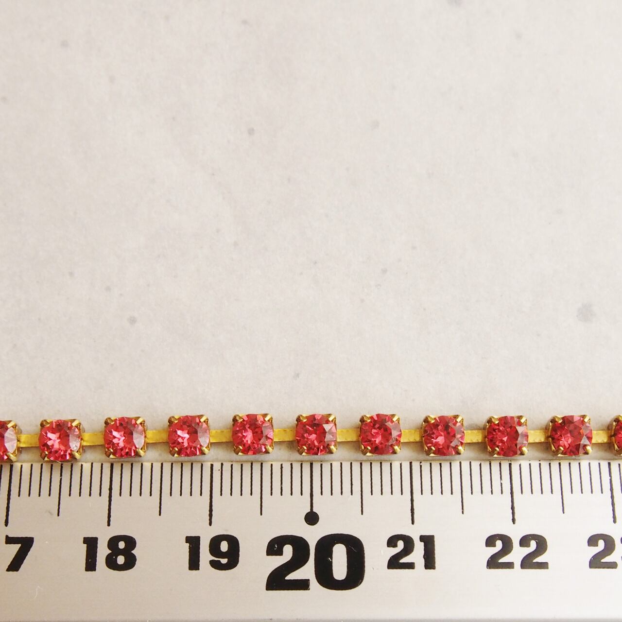 透明感のあるローズピンクのラインストーンがセッティングされたチェーンです。とてもきれいな状態で、すっきりとした色合い。小さくカットしてフリンジのようなピアスなんかを作るとキラキラして顔周りも明るくなりそうです。2つ以上ご購入の場合は繋げたままお届けします。