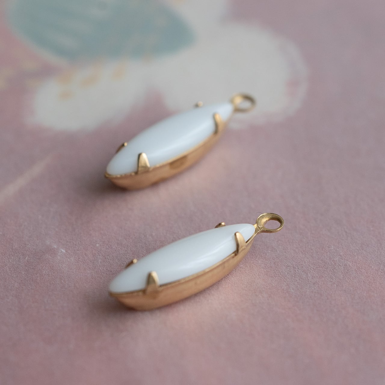 ナヴェットのミルクガラスチャームです。ミルクガラスはとても鮮やかな色が特徴的です。細長い形と鮮やかな色彩。大胆な色と繊細な形の絶妙なハーモニー、鮮やかな色は苦手な方もチャレンジできそうなチャームです。顔周りがパッと華やぎます。