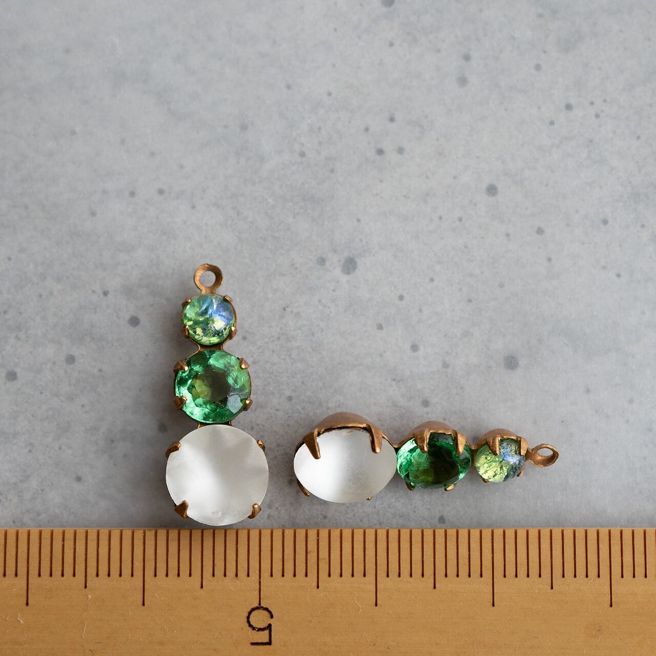 上からグリーンオパールカラー、グリーンカットガラス、フロストガラスの3つのヴィンテージガラスを組合せたチャームです。ペンダントトップにも、ピアスにもできる大きさで、これ一つで簡単にアクセサリーが作れます。小さなグリーンのオパールカラーのものは1950年代頃、後の二つは1920年代頃のものです。