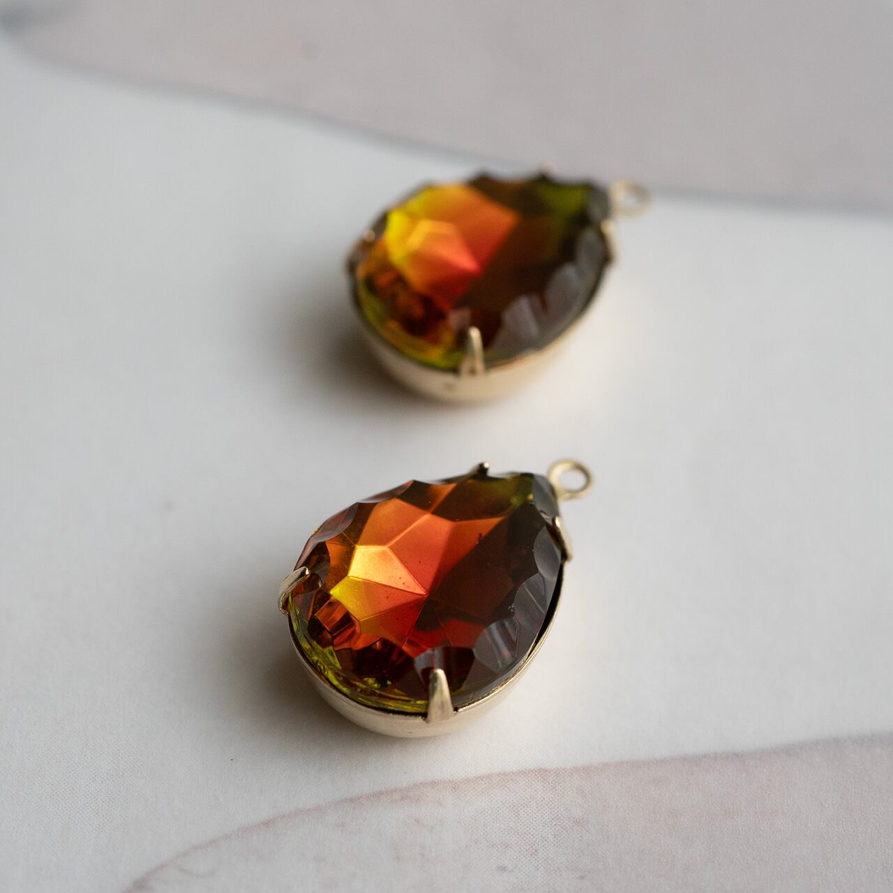 オレンジやブラウンに近い様なレッドと、渋めのグリーンのバイカラーのストーンチャームです。縁のカットは波型、帆立貝に例えられることもある趣向を凝らしたカットが施されています。この方法だと正面から見ると柊の葉っぱのようにも見えます。色もこのさりげないカットの手法も粋な雰囲気がギュッと詰まったようなストーンです。