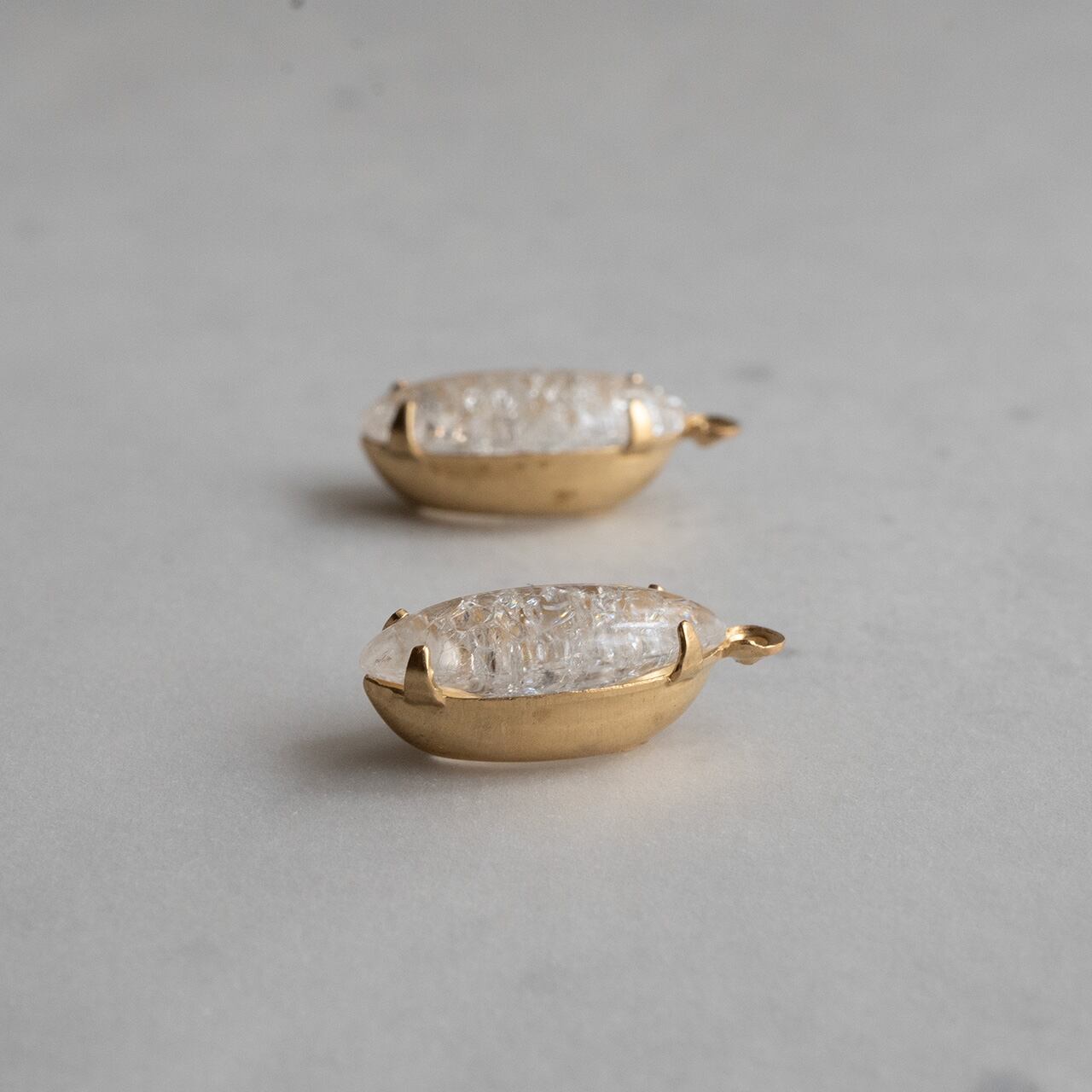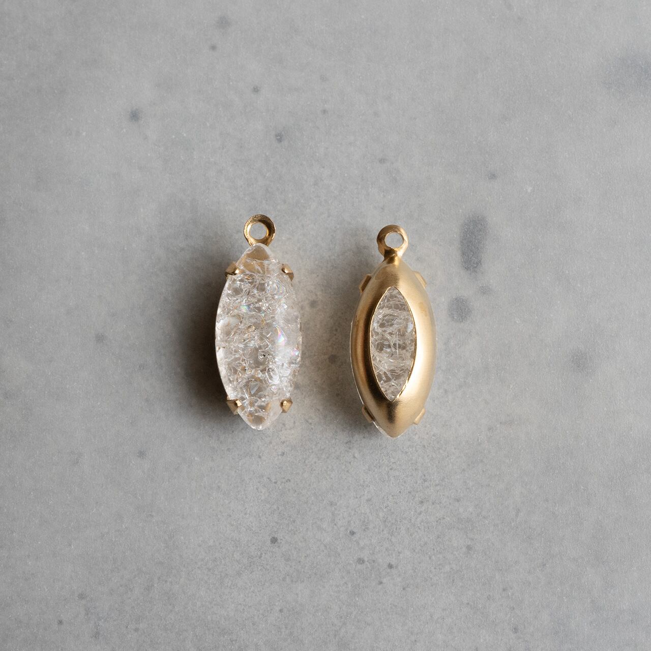 色も何もないクリアのクラック(欠け)ガラスのチャームです。無なはずのクリアなのに色がついているように見えると思ったら、真鍮セッティングの色を移して砂金が入っているみたい!シンプルで不思議でおもしろい、ストーンチャームです。